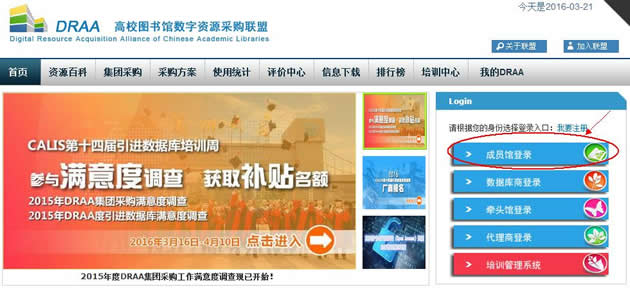 进入DRAA主页(http://www.libconsortia.edu.cn/),点击“成员馆登录”。如果还没有DRAA账号,可直接点击“我要注册”;如果不是DRAA成员馆需签署委托协议后方能审批通过成为DRAA成员馆。