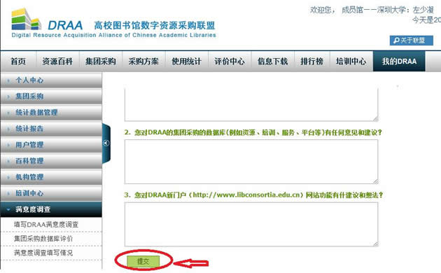 进入“DRAA集团采购工作满意度调查表”进行填写,依次作答后点“提交”完成调查表。