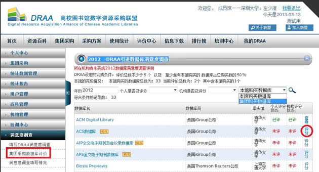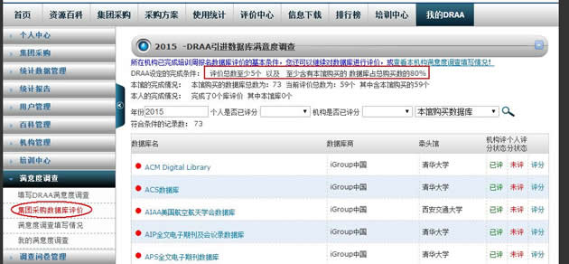 “我的DRAA”下“满意度调查”点击“集团采购数据库评价”进入“DRAA引进数据库满意度调查”,默认只显示本馆购买数据库,也可下拉选择“集团购买数据库”查看集团购买数据库清单。选择要评价的数据库点击“评分”。