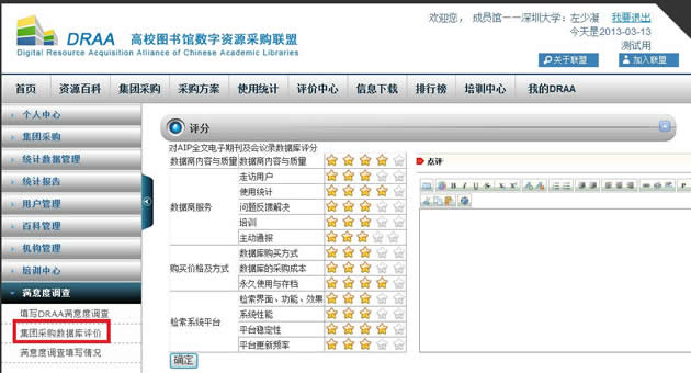 进入数据库评价页面,对数据库进行评分(必填)或评论(非必填)后,点击“确定”提交。