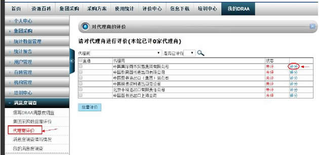 “我的DRAA”下“满意度调查”点击“代理商评价”进入“DRAA代理商服务满意度调查”,选择贵馆合作的代理商进入评分页面进行评价。操作方法同数据库商评价。至少选择本馆合作的两家代理商评价。