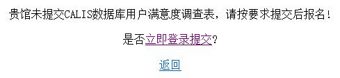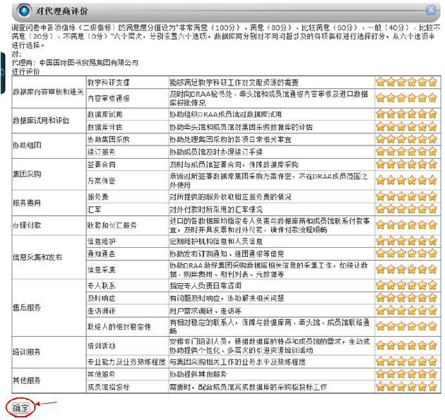 1、本机构需提交2份满意度调查表(一个账号一份) 2、完成不少于80%的本馆购买“数据库评价”,并且机构评价的数据库数量不少于5个(按机构馆统计) 3、完成不少于2家“代理商评价”(按机构馆统计) |
