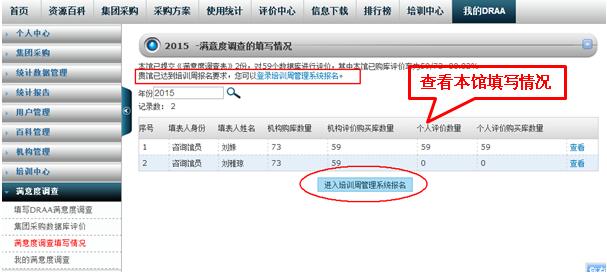 “我的DRAA”下“满意度调查填写情况”可看到本机构所有用户填写情况,如果达到报名要求(提交2份满意度调查表,完成不少于80%的本馆购买数据库评价,并且机构评价的数据库数量不少于5个,同时机构评价代理商数量不少于2家),采购联系人的界面会系统会出现“进入培训周管理系统报名”按钮,点进进入在线报名环节。