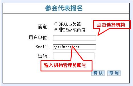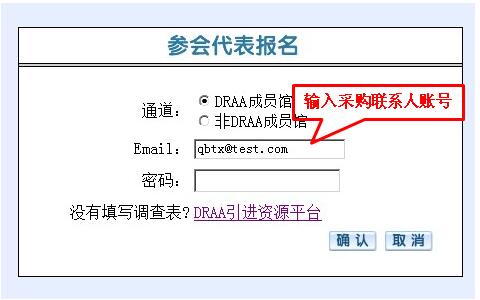 进入“代表报名”页面,默认进入DRAA成员馆通道,用户输入DRAA门户中“集团采购联系人”用户名和密码登录。采购联系人账号查询DRAA请咨询:李莹 老师 liy@calis.edu.cn 010-62755595-120。