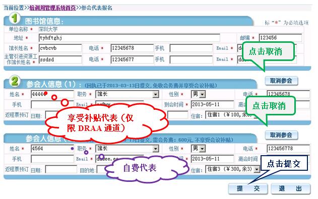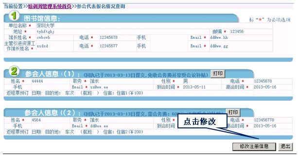 报名后,可重登陆“参会代表报名”查询本馆报名情况,参会人员如有调整,或者取消参会请点击“修改注册信息”。操作方法同第二步报名。(自费代表付费后将本页面截图发给CALIS联系人,非填写的提交页面)
