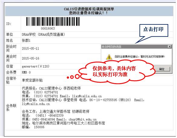 确认报名信息不会变更后,请登陆“参会代表报名”打印“CALIS引进数据库培训周报到单”(一人一份,非补贴名额需缴费后才能打印),切记:修改注册信息后请重新打印注册单。报到时请携带报到单办理注册手续。