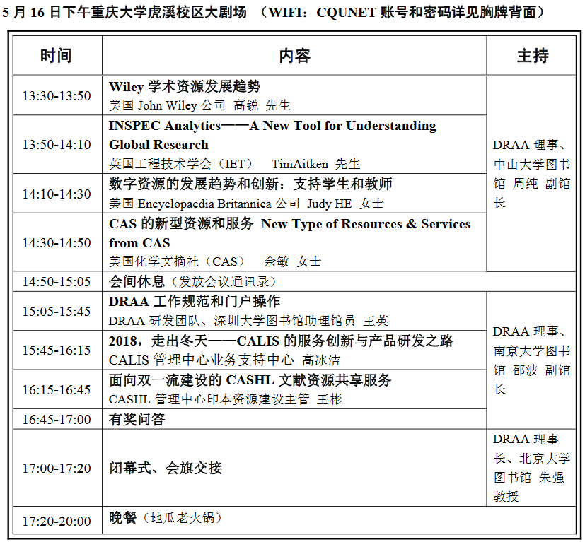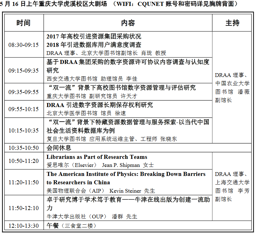 主办单位:CALIS管理中心、DRAA理事会 承办单位:重庆大学图书馆 会议时间:2018年5月15日--18日