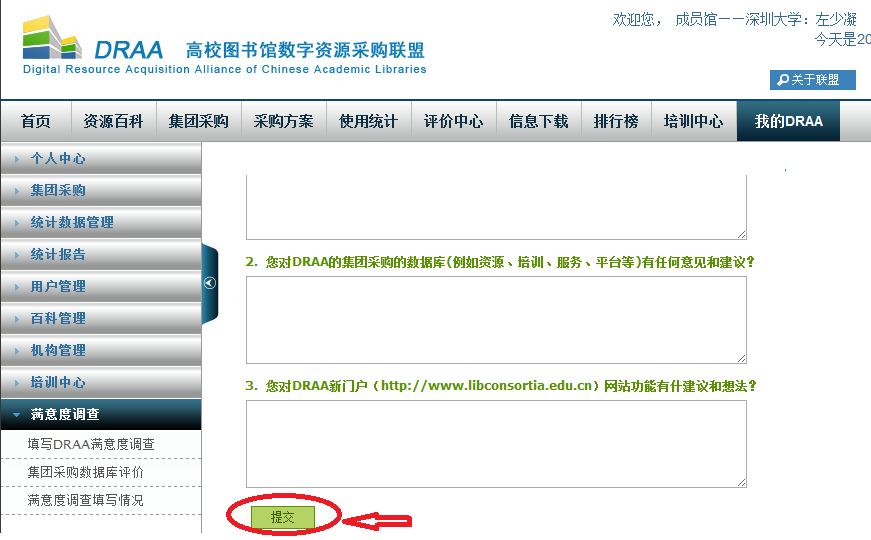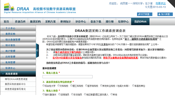 登录后进入“我的DRAA”下“满意度调查”,点击“填写DRAA满意度调查”.