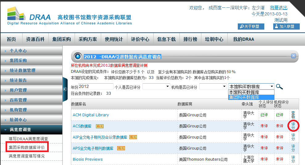“我的DRAA”下“满意度调查”点击“集团采购数据库评价”进入“DRAA引进数据库满意度调查” ,默认只显示本馆购买数据库,也可下拉选择“集团购买数据库”查看集团购买数据库清单。选择要评价的数据库点击“评分”。