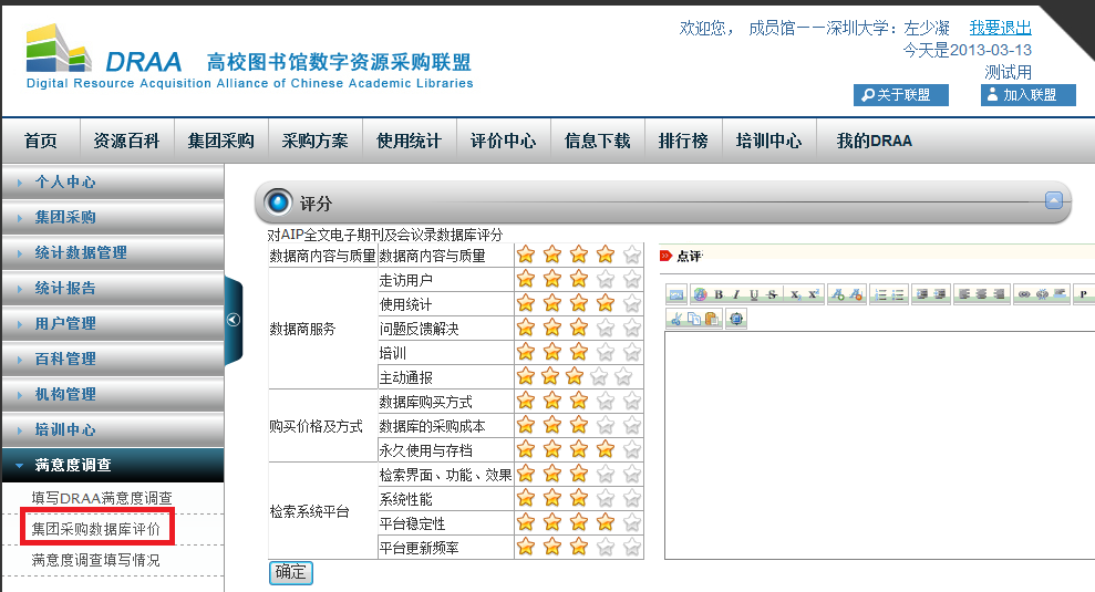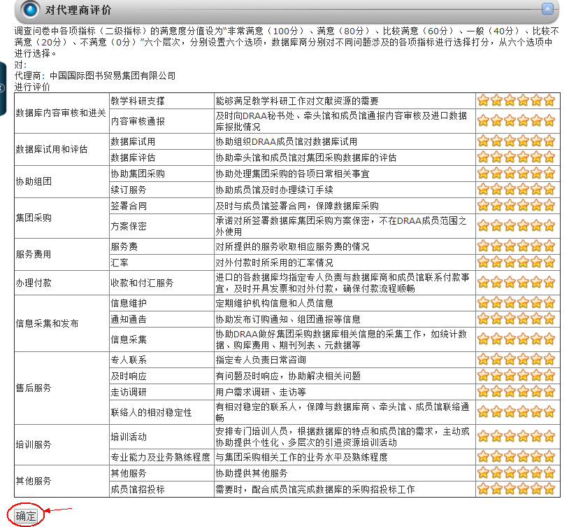 进入数据库评价页面,对数据库进行评分(必填)或评论(非必填)后,点击“确定”提交。