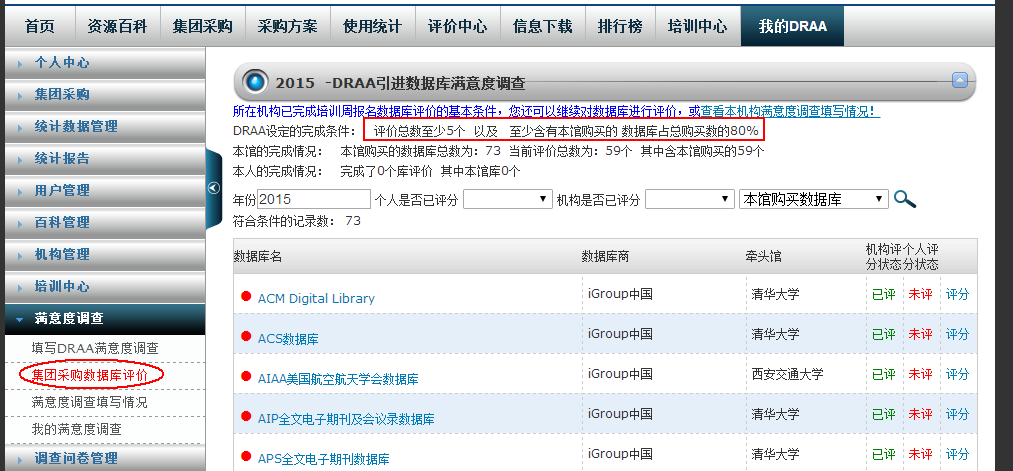 ü 完成不少于80%的本馆购买“数据库评价”,并且机构评价的数据库数量不少于5个(按机构馆统计)