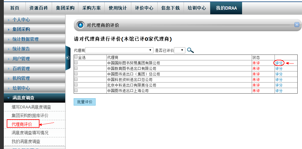 “我的DRAA”下“满意度调查”点击“代理商评价”进入“DRAA代理商服务满意度调查” ,选择贵馆合作的代理商进入评分页面进行评价。操作方法同数据库商评价。至少选择本馆合作的两家代理商评价。