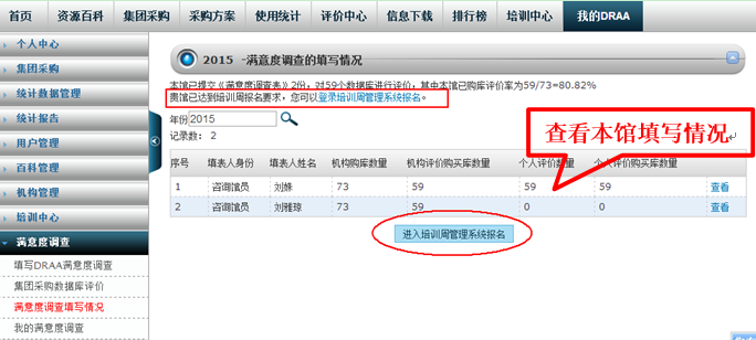 “我的DRAA”下“满意度调查填写情况”可看到本机构所有用户填写情况,如果达到报名要求(提交2份满意度调查表,完成不少于80%的本馆购买数据库评价,并且机构评价的数据库数量不少于5个,同时机构评价代理商数量不少于2家),采购联系人的界面会系统会出现“进入培训周管理系统报名”按钮,点进进入在线报名环节。