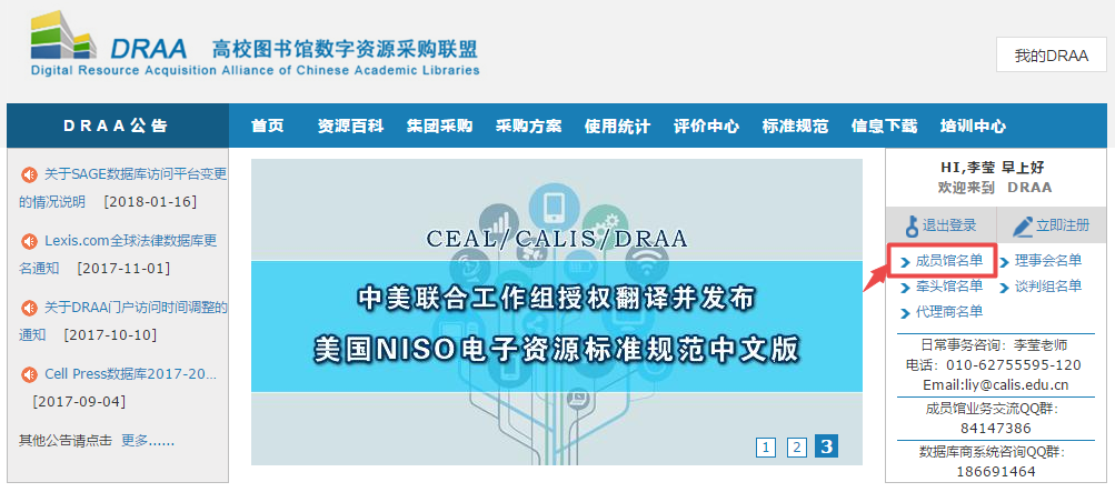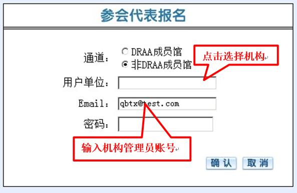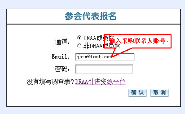进入“代表报名”页面,默认进入DRAA成员馆通道,用户输入DRAA门户中“集团采购联系人”用户名和密码登录。采购联系人账号查询DRAA请咨询:李莹 老师 liy@calis.edu.cn 010-62755595-120