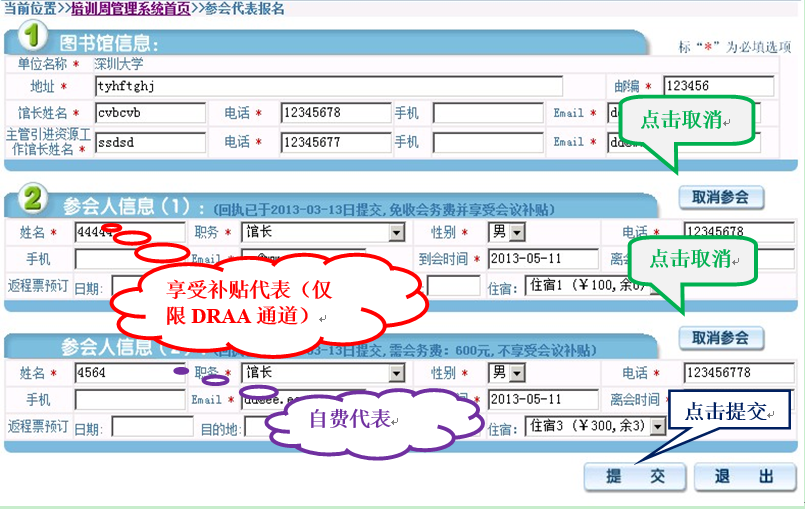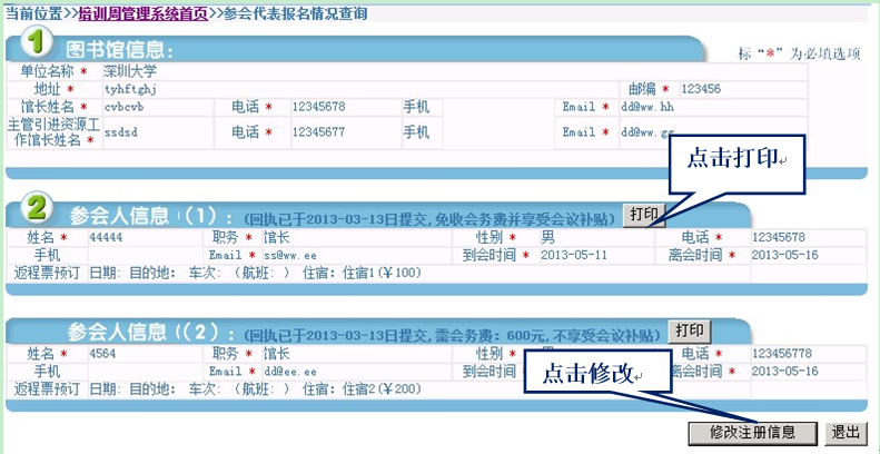 报名后,可重登陆“参会代表报名”查询本馆报名情况,参会人员如有调整,或者取消参会请点击“修改注册信息”。操作方法同第二步报名。(自费代表付费后将本页面截图发给CALIS联系人,审核后方能打印报到单)