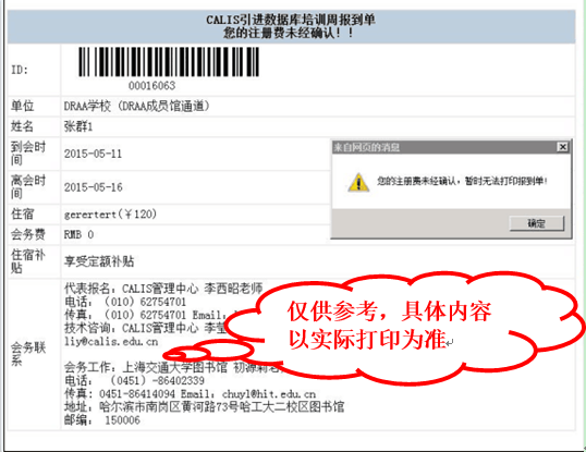 确认报名信息不会变更后,请登陆“参会代表报名”打印“CALIS引进数据库培训周报到单”(一人一份,非补贴名额需缴费后才能打印),切记:修改注册信息后请重新打印注册单。报到时请携带报到单办理注册手续。