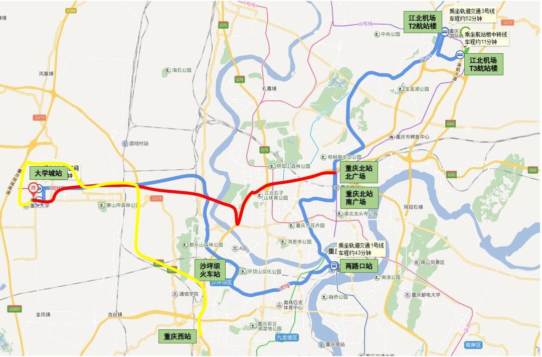 公交:江北机场T3航站楼—(机场免费接驳车)—江北机场T2航站楼—(转乘轻轨三号线)—两路口站—(站内换乘地铁一号线)—大学城站1号口—(转乘240路公交)—大学城美院站—步行520米,全程约3小时,60公里左右,票价9元左右。